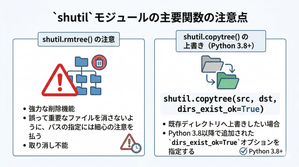 shutil.rmtree() は強力な削除機能なので、誤って重要なファイルを消してしまわないよう、パスの指定には細心の注意を払いましょう。 また、shutil.copytree() で既存のディレクトリに上書きしたい場合は、Python 3.8以降で追加された dirs_exist_ok=True オプションを忘れずに指定してくださいね。