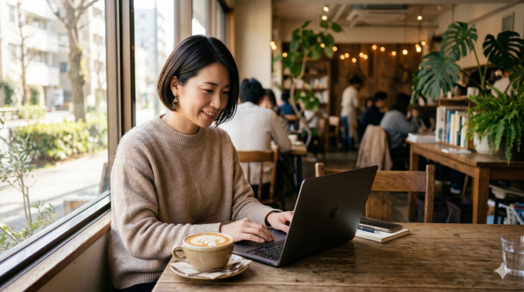 昼下がりのカフェで、窓から差し込む柔らかな光を浴びながら、ノートパソコンで作業する女性。