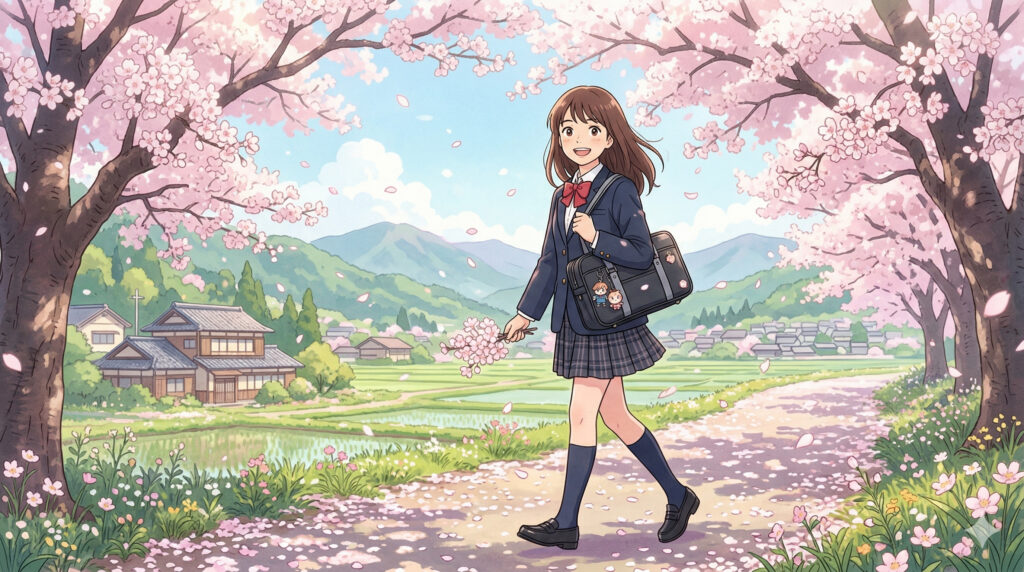 桜並木の下を、制服姿の女子高生が笑顔で歩いている。
