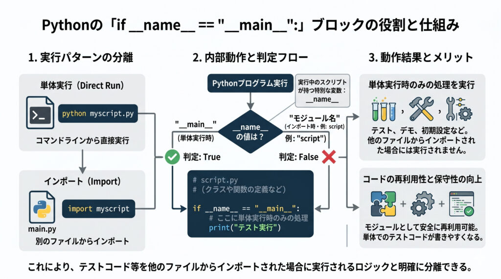 このif __name__ == "__main__":という書き方は、Pythonプログラミングにおける「お作法」のようなものです。これにより、テストコードや初期設定など、そのファイルが単体で動作するときにだけ実行したい処理を、他のファイルからインポートされた場合に実行されるロジックと明確に分離できるため、コードの再利用性や保守性が大きく向上します。