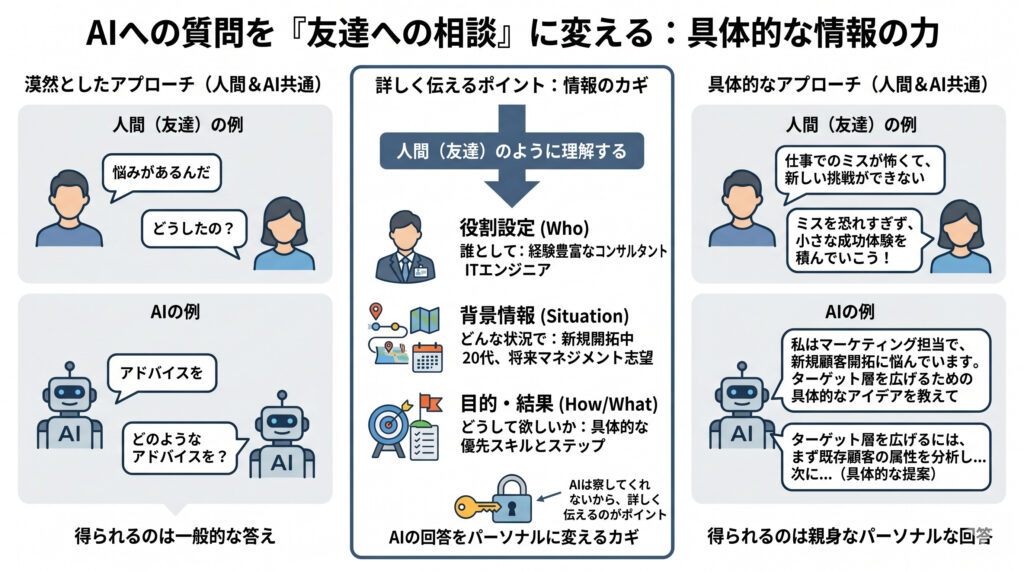 AIに質問する時、まるで友達に相談する時と一緒。漠然とした質問では、漠然とした答えしか返ってこないよね。でも、自分の状況や気持ち、何を求めているかをしっかり伝えれば、親身なアドバイスがもらえるはず。AIも同じで、AIに「誰として、どんな状況で、どうして欲しいか」を詳しく伝えることで、まるで人間のように状況を理解し、よりパーソナルで役立つ回答をくれるんだ。役割設定と背景情報がカギになるよ。