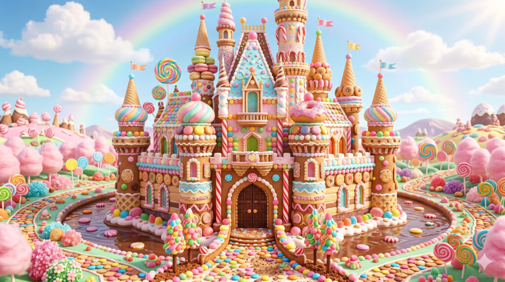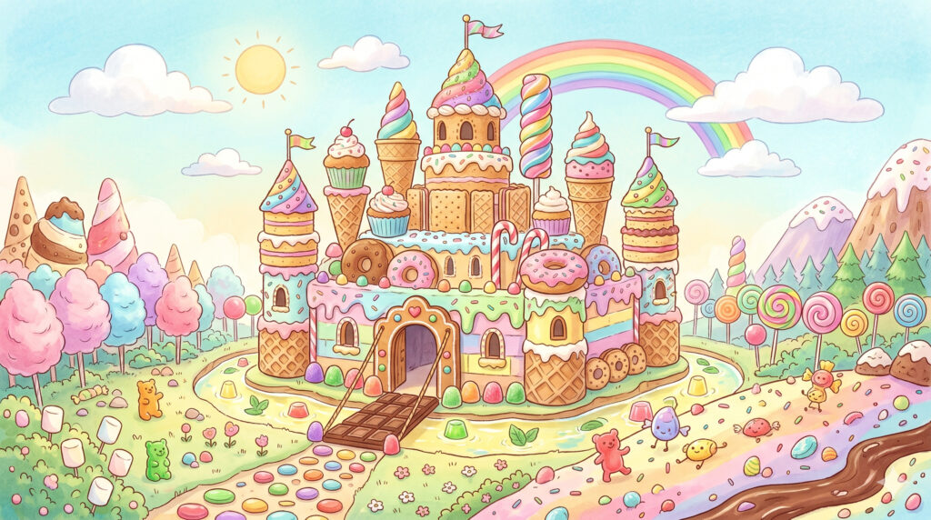 「お菓子でできたお城」だけだと、AIがランダムに色々なお菓子を組み合わせてくれるけど、「マカロンの屋根」「クッキーの壁」「チョコレートの川」みたいに、具体的なお菓子の名前を入れると、よりイメージ通りのディテールが表現されやすくなるよ!