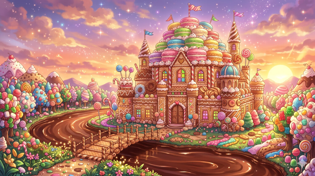 チョコレートの川が流れ、キャンディの木が生い茂る。