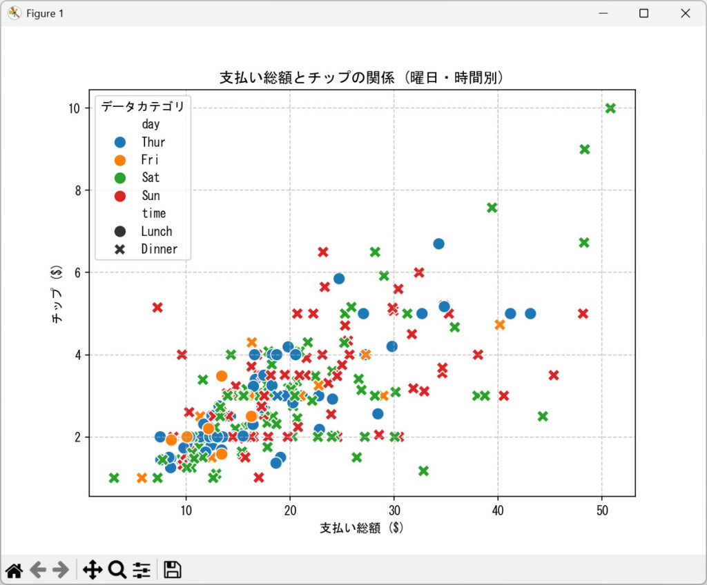 上記のコードを実行すると、支払い総額とチップの関係、支払い総額の分布、そして曜日ごとのチップの分布を視覚的に理解できるグラフが生成されます。hueやstyleといった引数を指定するだけで、複数の変数を同時に表現できるのがseabornの強みです。