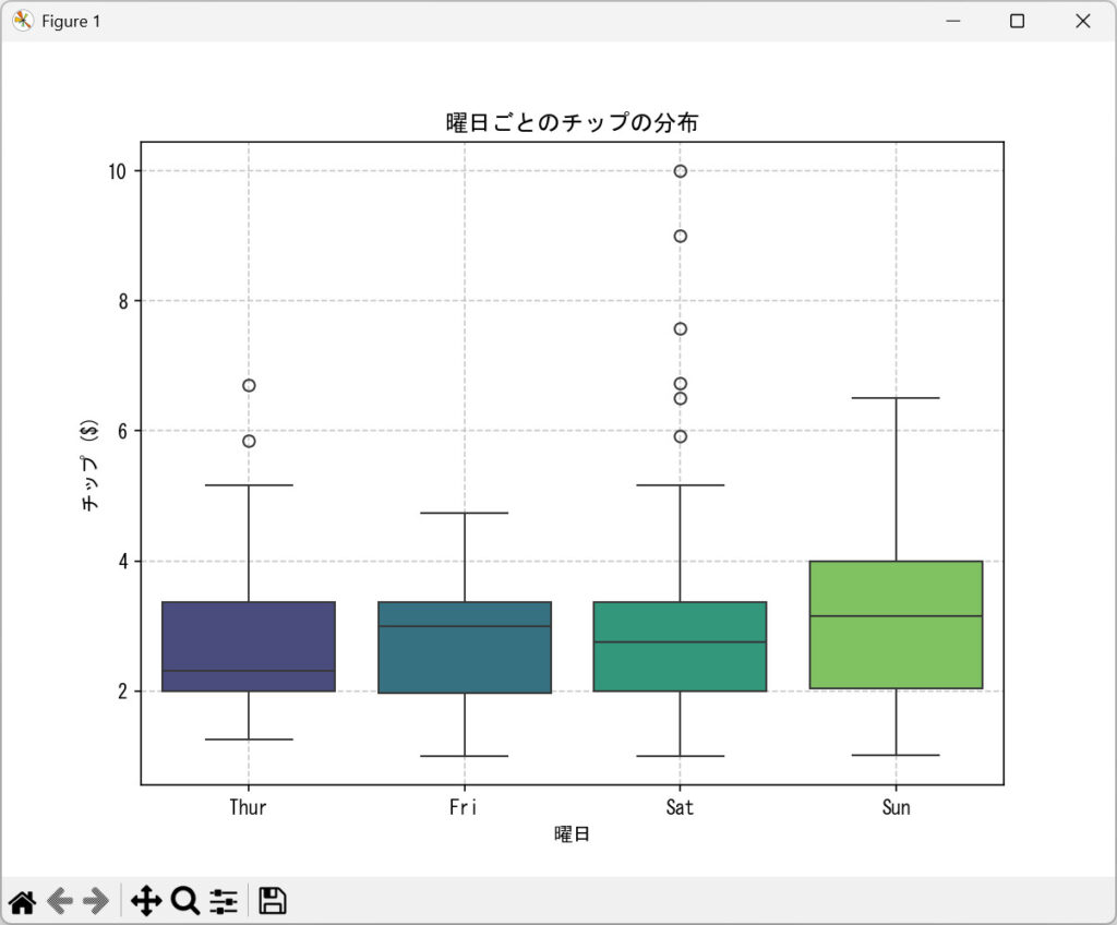 # 3. 箱ひげ図: 曜日ごとのチップの分布を比較