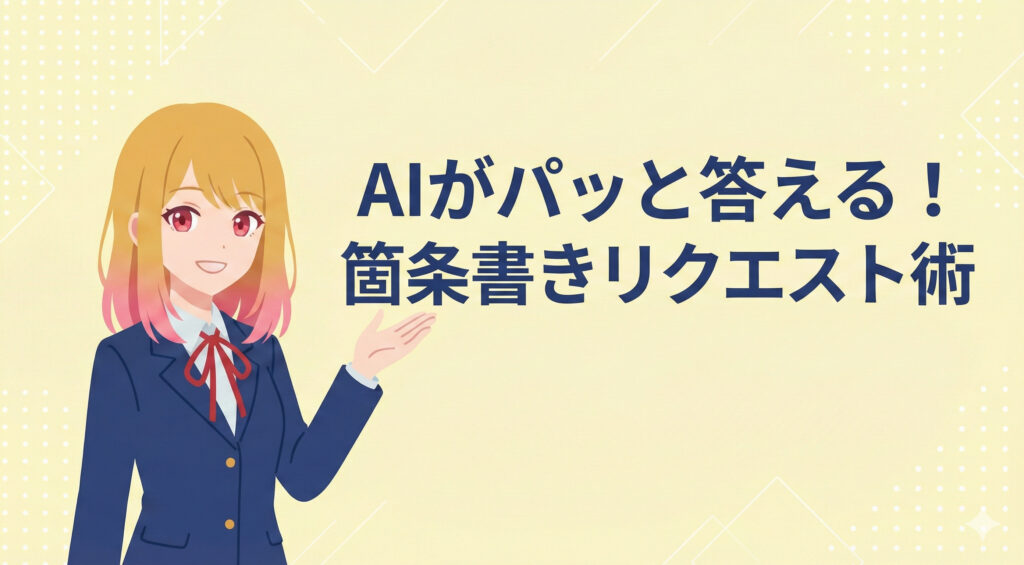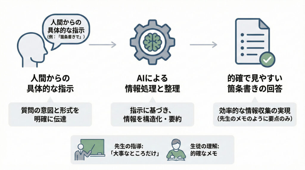 AIは、私たちが質問した通りの形式で答えようと頑張ってくれるんだ。だから、「箇条書きで」と具体的に伝えると、AIは情報を整理して、ポイントを絞って出力してくれる。