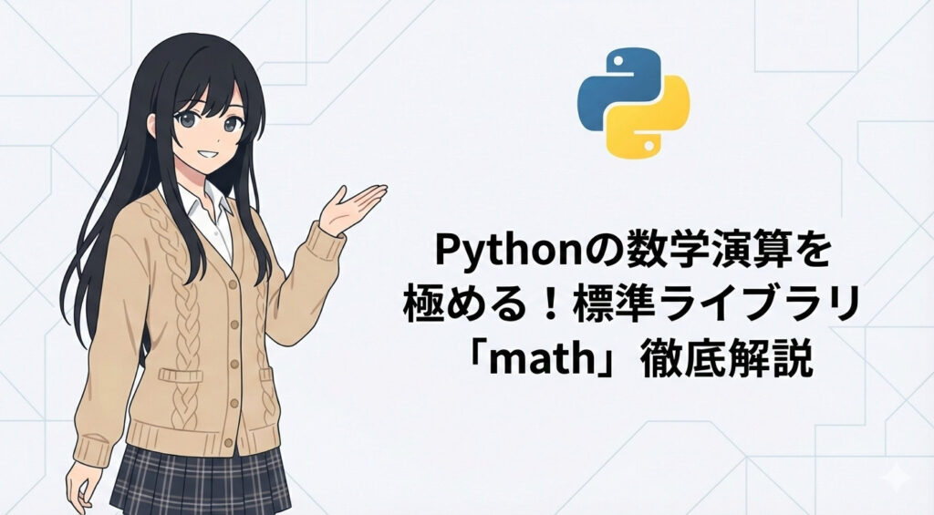 mathライブラリは、Pythonに組み込まれている数学関数を提供する標準モジュールです。三角関数、指数・対数関数、平方根、定数など、プログラミングで頻繁に利用する基本的な数学的機能を網羅しています。Pythonをインストールすればすぐに利用できるため、追加のパッケージインストールは不要です。科学技術計算、データ分析、ゲーム開発、金融アプリケーションなど、数値処理が求められるあらゆる分野でその真価を発揮します。