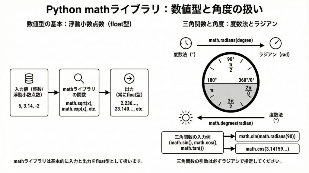 mathライブラリの関数は、基本的に浮動小数点数(float型)を扱います。また、三角関数の引数は度数法ではなく、ラジアンで指定する必要がある点に注意してくださいね。math.radians()とmath.degrees()を使えば、度数とラジアンの変換も簡単にできますよ!