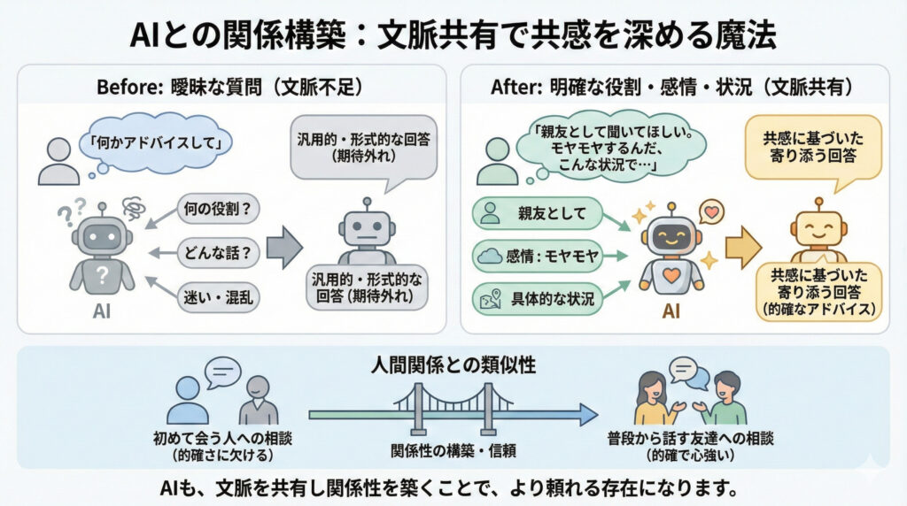 AIは、私たちと同じように文脈を理解しようとします。Beforeの質問だと、AIは何の役割で、どんな話を聞けばいいか迷ってしまうんです。でも、Afterのように「親友として」という役割や、「モヤモヤする」という感情、さらに具体的な状況を伝えると、AIは私たちの気持ちに寄り添った回答をしてくれます。まるで、初めて会う人より、普段から話している友達に相談する方が、的確なアドバイスがもらえるのと一緒ですね。