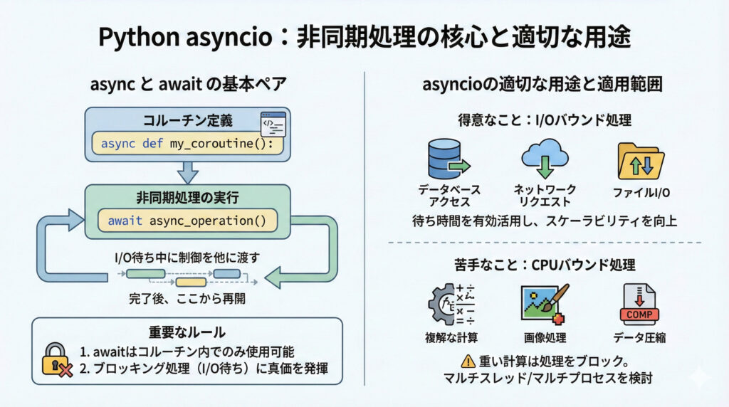 asyncioを使う上で最も大切なのは、asyncとawaitのペアを正しく使うことです。特に、awaitはコルーチン内でのみ使用可能であり、I/O待ちなどの「ブロッキング処理」に対して真価を発揮します。CPUヘビーな計算処理には不向きなので、用途に応じて適切な並行処理手法(マルチスレッドなど)を選ぶようにしましょう。
