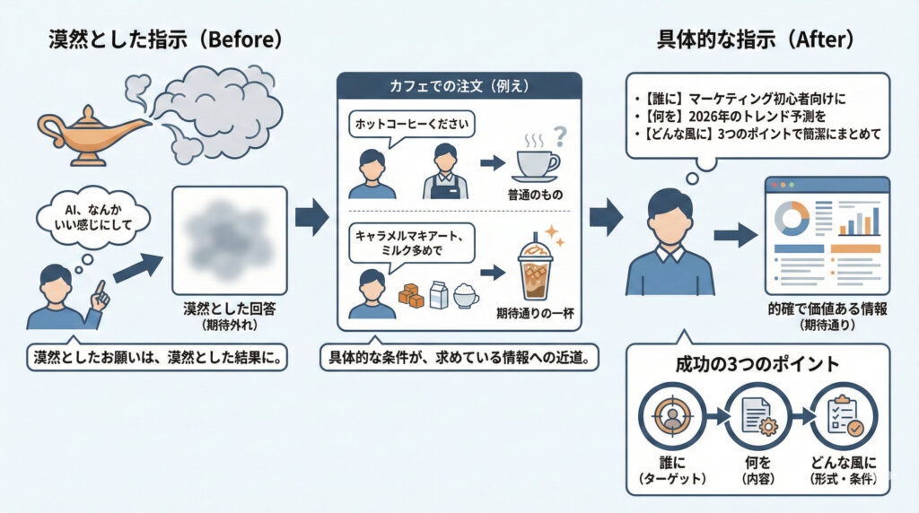 AIは魔法のランプじゃないから、漠然としたお願いだと、漠然とした答えが返ってくるの。でも、欲しいものを具体的に伝えれば、AIもそれに合わせて情報を絞り込んでくれるんだ。まるでカフェで注文する時みたいに、「ホットコーヒーください」より「キャラメルマキアート、ミルク多めで」って言った方が、期待通りのものが出てくるでしょ?AIも同じで、具体的な条件をたくさん伝えるほど、求めている情報に近づけるんだ。