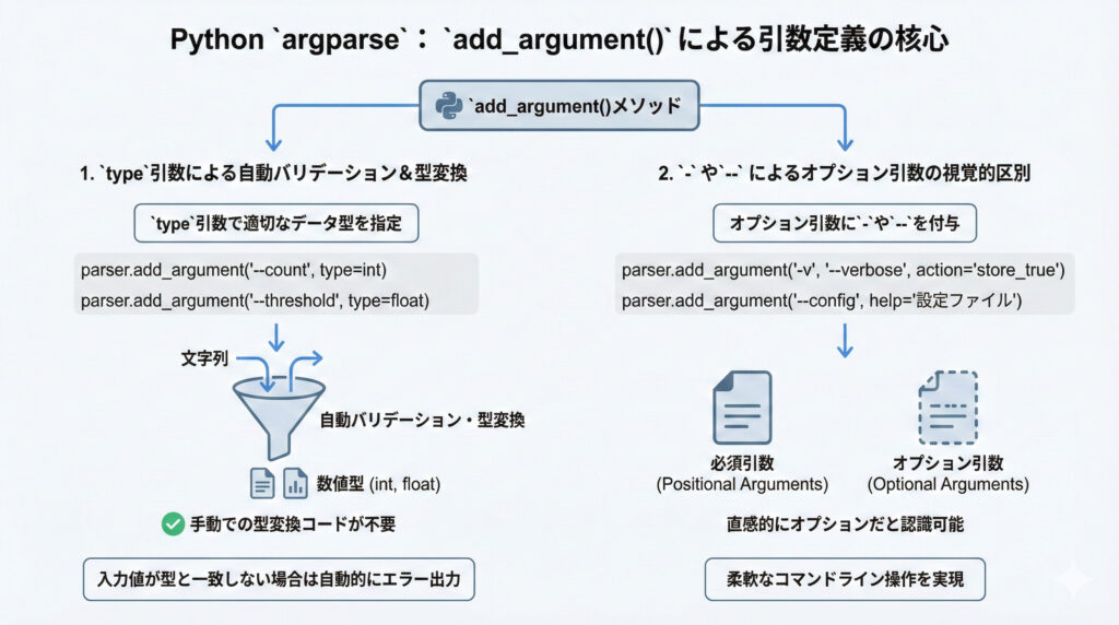 argparseを使う上で最も重要なのは、add_argument()メソッドで引数をどのように定義するかです。特にtype引数で適切なデータ型を指定することで、入力値のバリデーションを自動で行ってくれるので、自分で型変換のコードを書く手間が省けます。また、オプション引数には-や--を付けることで、直感的にオプションだとわかるように区別しましょうね。