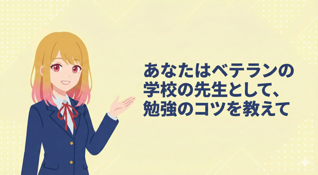 「皆さん、こんにちは!ベテラン教師の私が、皆さんの悩みに寄り添い、具体的な勉強法をお伝えしますね。」