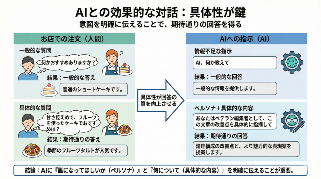 AIは私たちの質問から意図を読み取るのが得意。でも、情報が少ないと一般的な答えしか出せないの。まるで初めて行くお店で「何かおすすめありますか?」って聞くのと、「甘さ控えめで、フルーツを使ったケーキでおすすめは?」って聞くのと同じ。後者の方が、本当に食べたいものに出会える確率が高いよね。AIも同じで、「誰になってほしいか(ペルソナ)」と「何について(具体的な内容)」を明確に伝えることで、期待通りの答えをくれるようになるんだ。