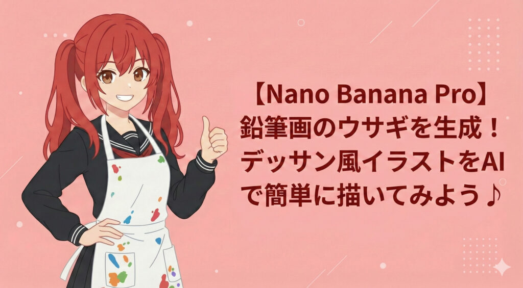 今日は「Nano Banana Pro(Geminiの画像生成)」を使って、初心者さんでもシンプルかつ簡単に、まるで本物みたいな「鉛筆画のウサギ」を生成する方法を紹介しますね。デッサン風の絵って、AIを使うとすっごく簡単に作れちゃうんですよ!