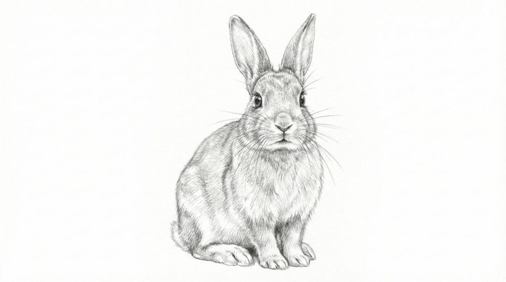 鉛筆画、デッサン、ウサギ、写実的、繊細なタッチ、白背景、正面を向いている、座っている。