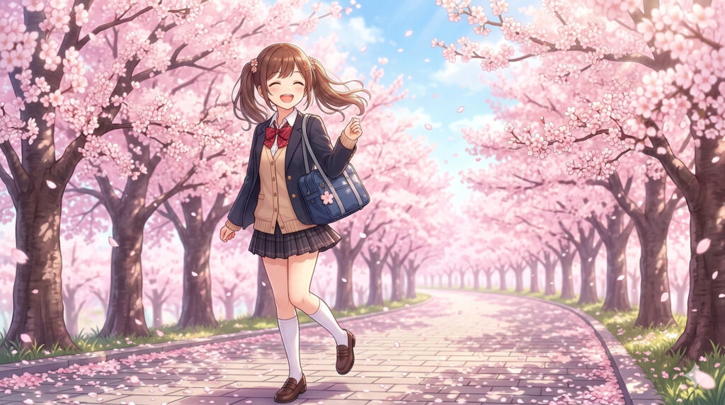 桜並木を歩く、明るい表情の女子高生、背景に通行人は描かないでください。