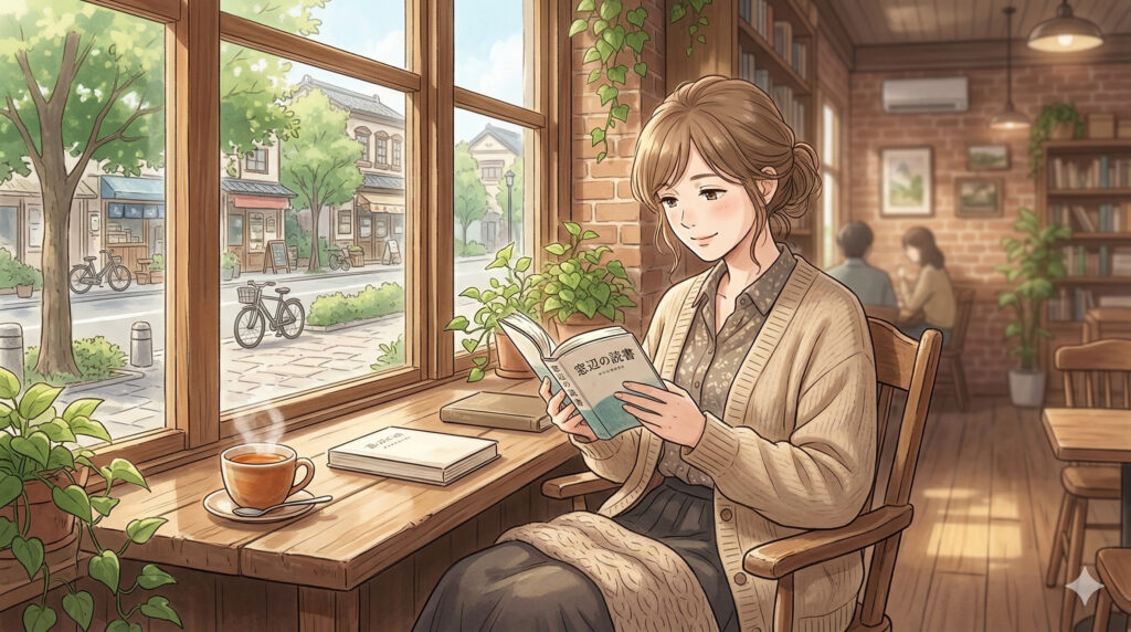 窓際のカフェで本を読む、リラックスした雰囲気の女性、テーブルに食べ物は描かないでください。