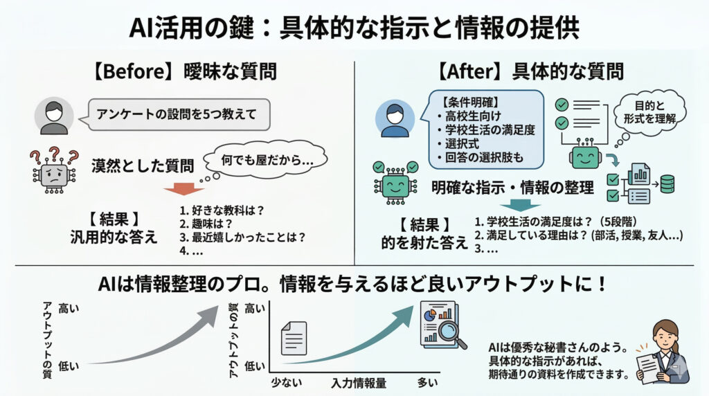 Beforeの質問は「アンケートの設問を5つ」だけ。AIは「何でも屋」だから、漠然とした質問には漠然とした答えしか返せません。一方、Afterの質問は「高校生向け」「学校生活の満足度」「選択式」「回答の選択肢も」と、ターゲット、目的、形式、具体的な条件を明確に伝えました。 AIは優秀な秘書さんのようなもの。指示が曖昧だと、どこから手をつけていいか困っちゃうよね。具体的に「〇〇について、△△の形式で、□□な人に向けた資料を作って」と伝えると、期待通りのものが出てくるのと同じです。