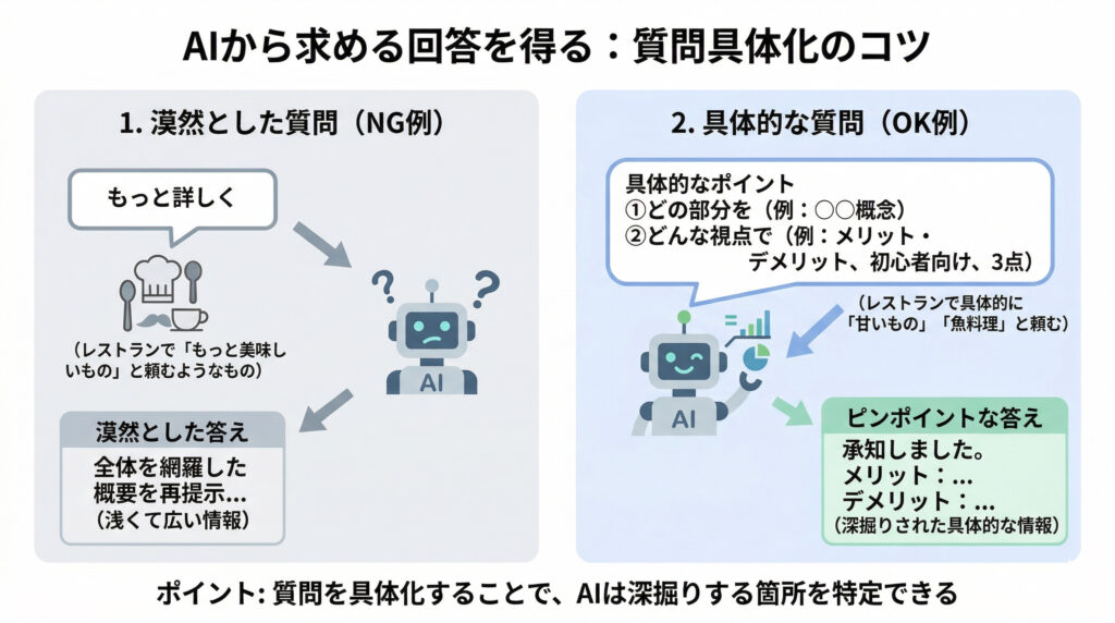 AIは「漠然とした質問」には「漠然とした答え」しか出せないの。「もっと詳しく」だけだと、AIはどこを深掘りすればいいか分からないんだ。例えるなら、レストランで「もっと美味しいもの」と頼むようなもの。具体的に「甘いもの」「魚料理」と言わないと、シェフも困っちゃうよね。具体的に「どの部分」を「どんな視点」で知りたいかを伝えるのがポイント。これでAIは、あなたが本当に求めている情報をピンポイントで教えてくれるはずだよ。