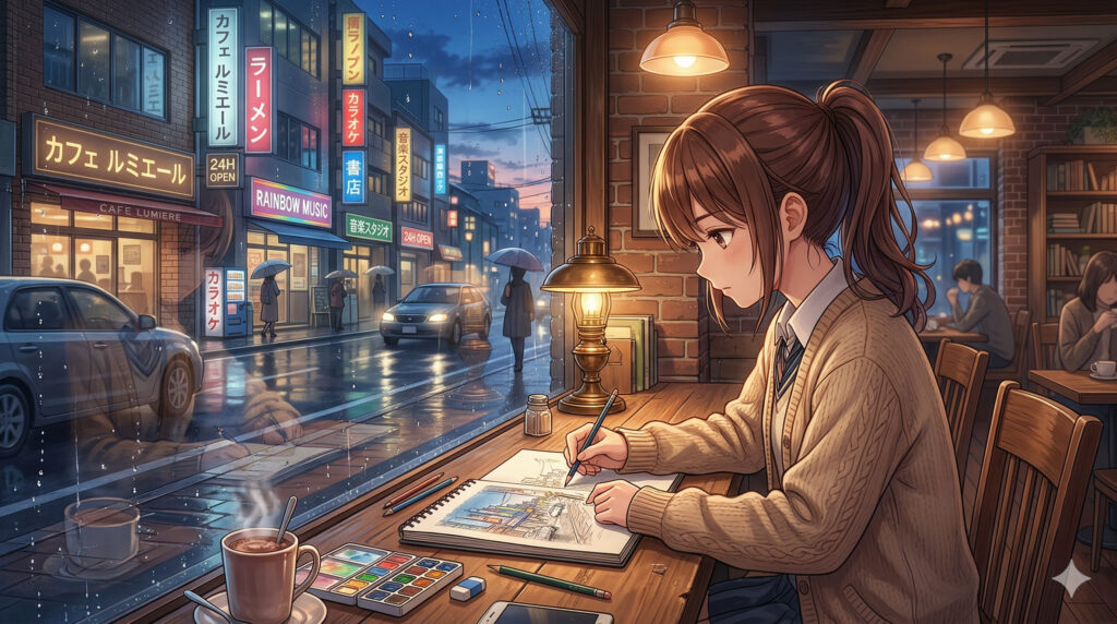 雨上がりの夕暮れ時、街角のカフェの窓際でスケッチブックを開いている少女。