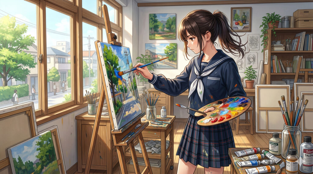明るいアトリエで、キャンバスに向かって絵を描いている制服の女子高生。